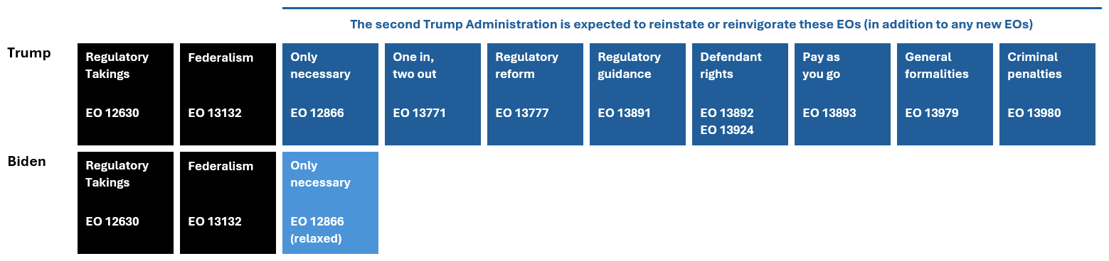 - The second Trump Administration may also seek to apply EOs to independent agencies.