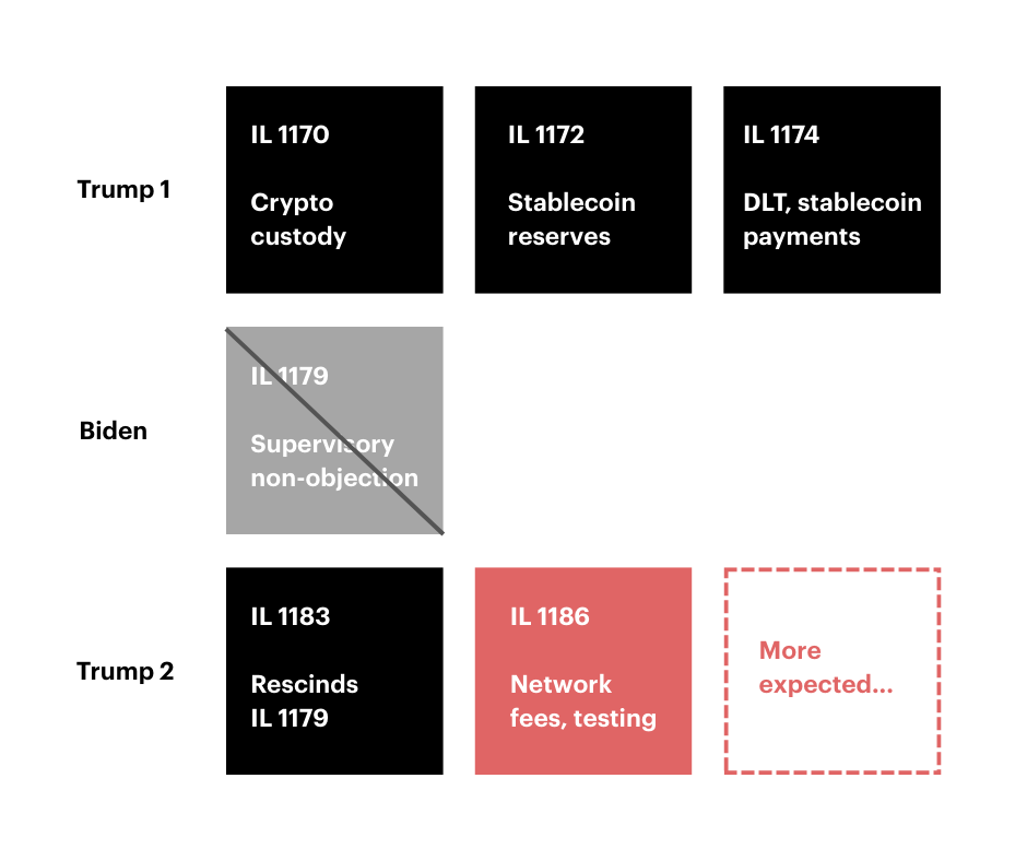 IL 1186 also continues the trend of the first Trump Administration's ILs that clarified that national banks may engage in key crypto-related activities.