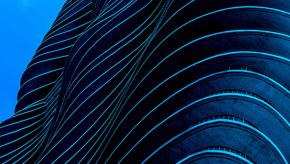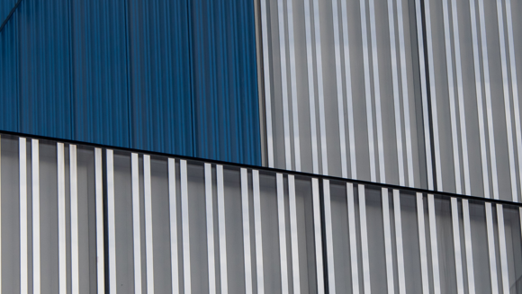 Blue glass panels on a building, arranged in a repeating geometric pattern.
